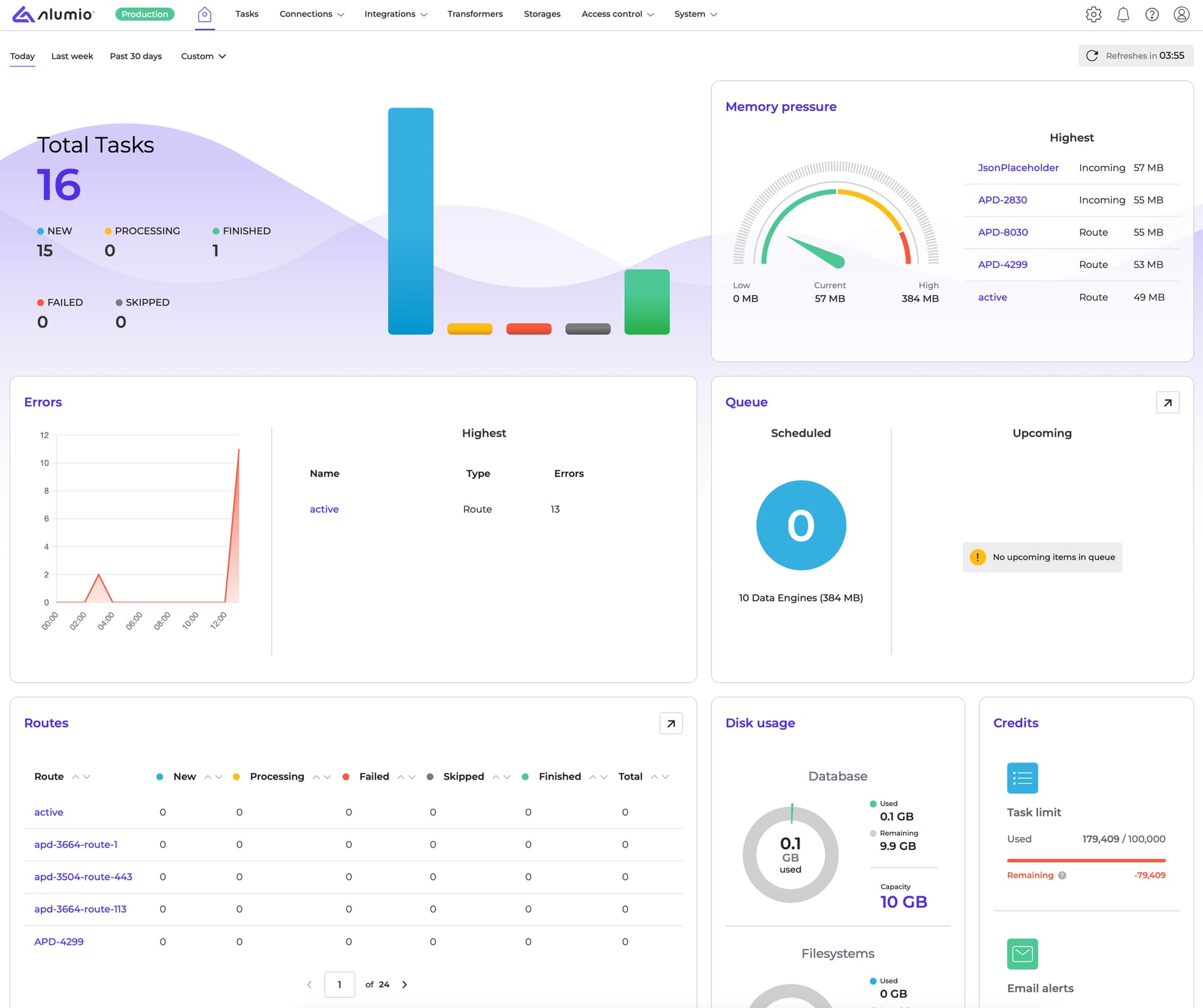 When logging into the Alumio environment, you always navigate to the Dashboard page where the main functionality about the state of your environment, statistics and processed amount of tasks is represented. In addition, using the menu panel from the Dashboard allows you to create a new connection, transform data, add storage, set up a scheduler to run tasks and verify system settings quickly.