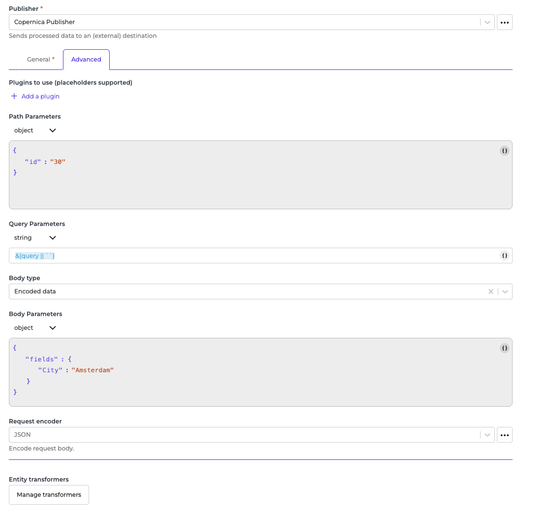 - You can optionally add a transformer to transform the request parameters into something you will request from Copernica.