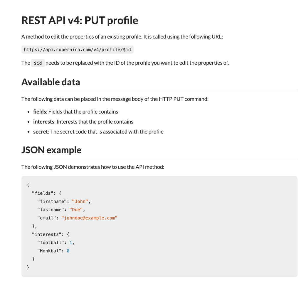 Alumio will send an API request to Copernica with URL PUT https://api.copernica.com/v4/profile/$id with the defined payload.