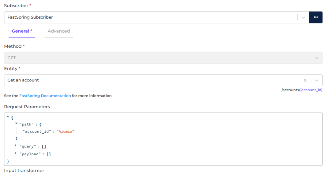 These are the parameters you can provide to get the needed entity based on FastSpring API Reference. Please look at the example below on how to fill the Request Parameters field when subscribing Get an account.