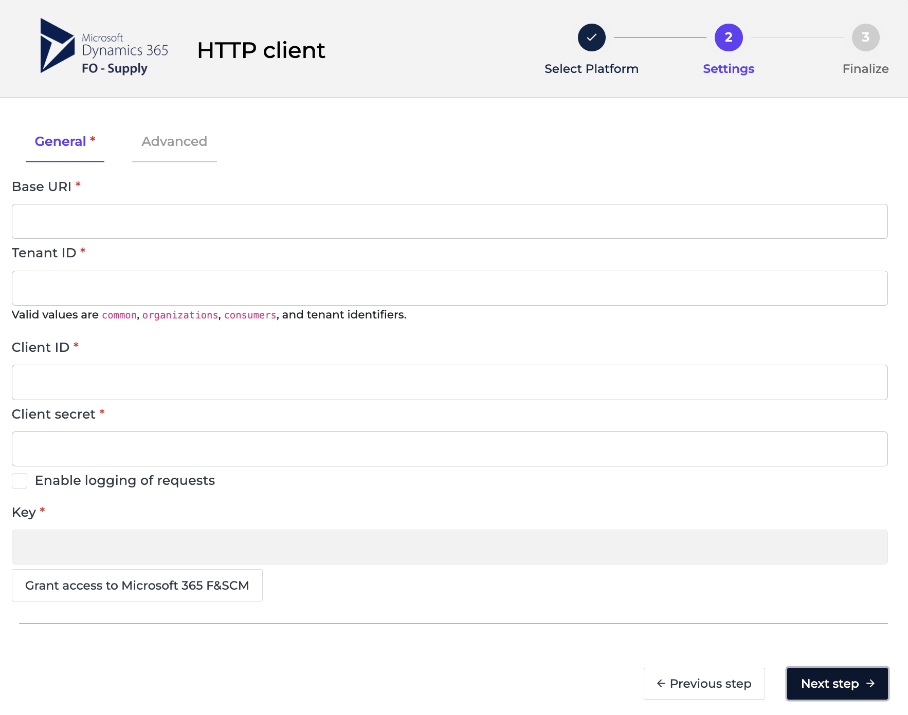 - Fill in the Base URI, Tenant ID, Client ID, and Client Secret of your Microsoft Dynamics 365 F&SCM instance and app credentials.