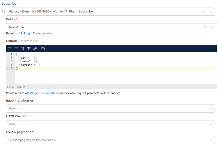 - Select the Microsoft Dynamics 365 F&SCM Alumio API Plugin HTTP Client to use.