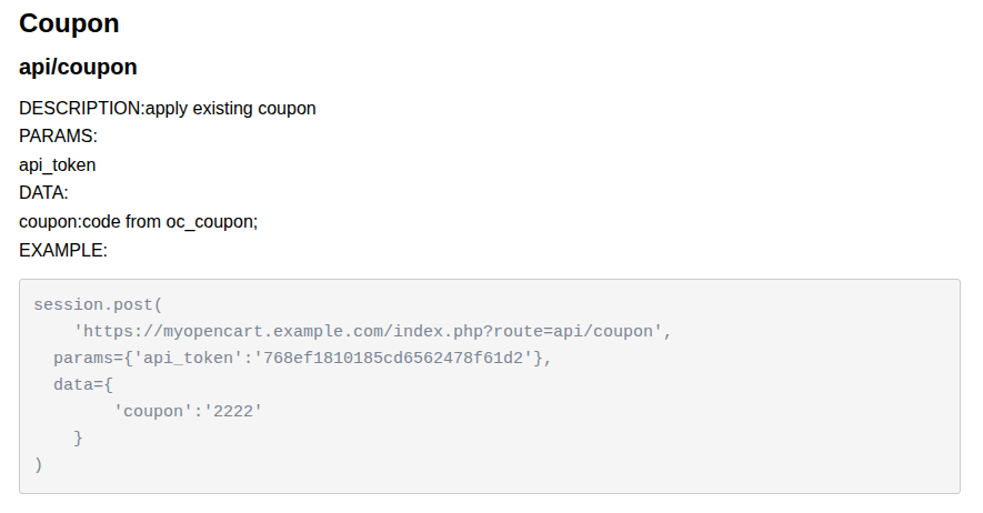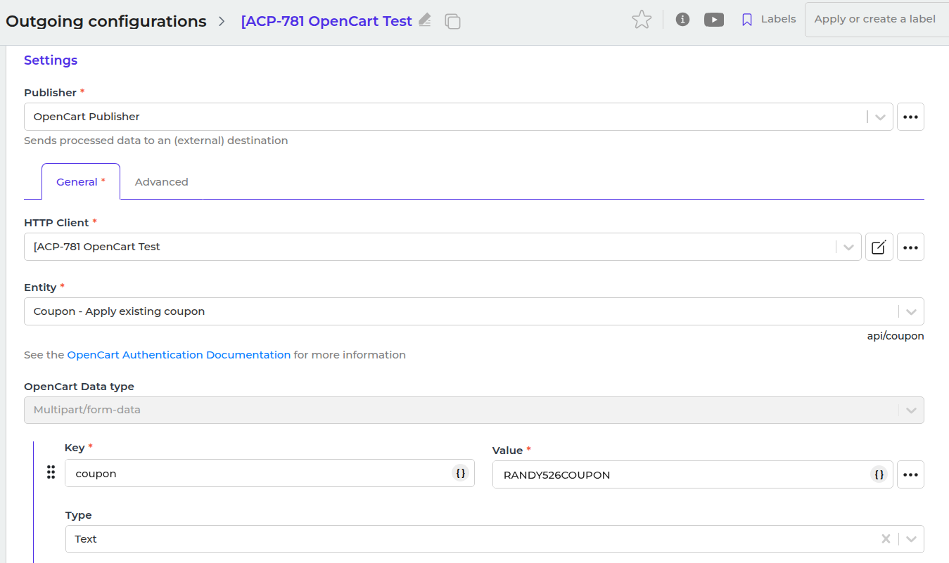 For example, we want to apply an existing coupon. Please select “Coupon - Apply existing coupon” and add data with Key “coupon” and the value of the code after OpenCart Data type.