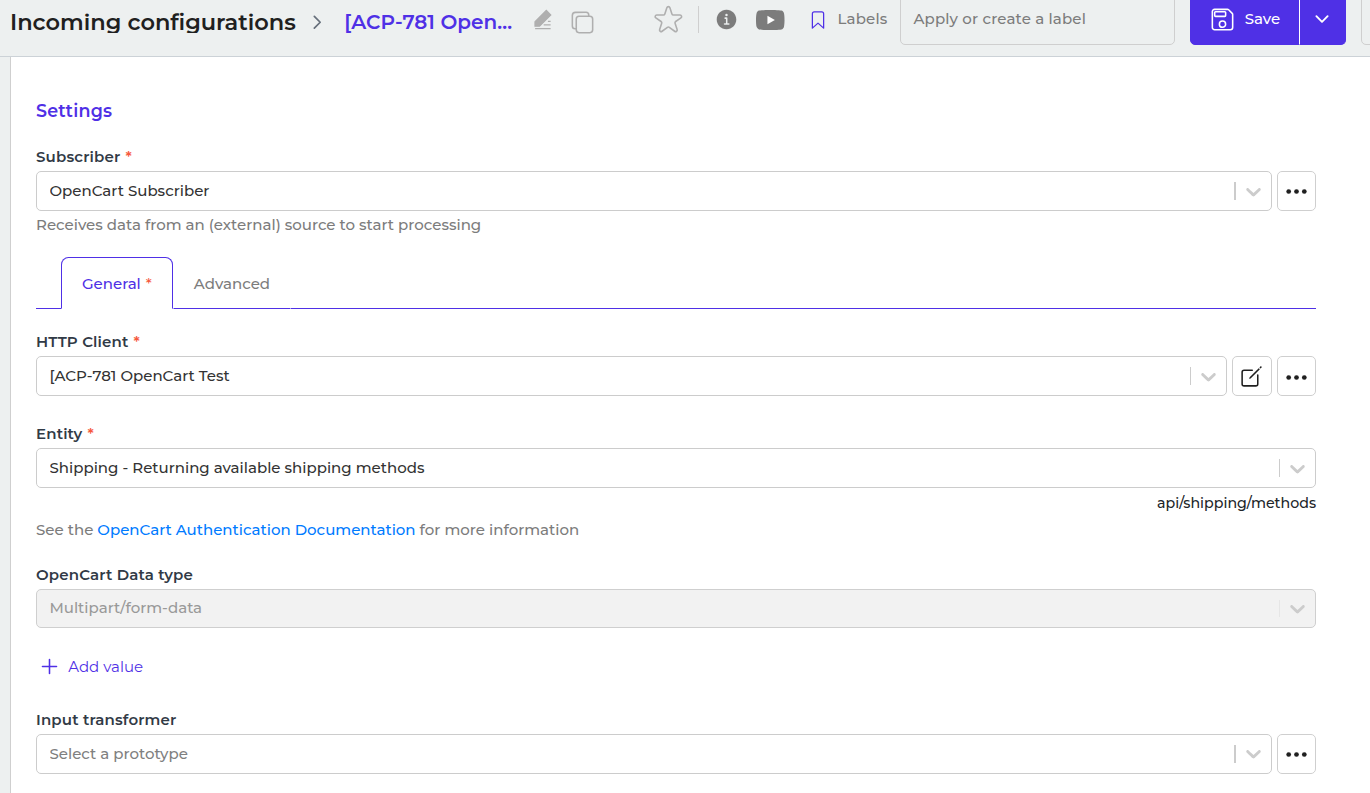 - Go to Connections → Incoming and create a new incoming configuration and select “OpenCart Subscriber” as the subscriber.