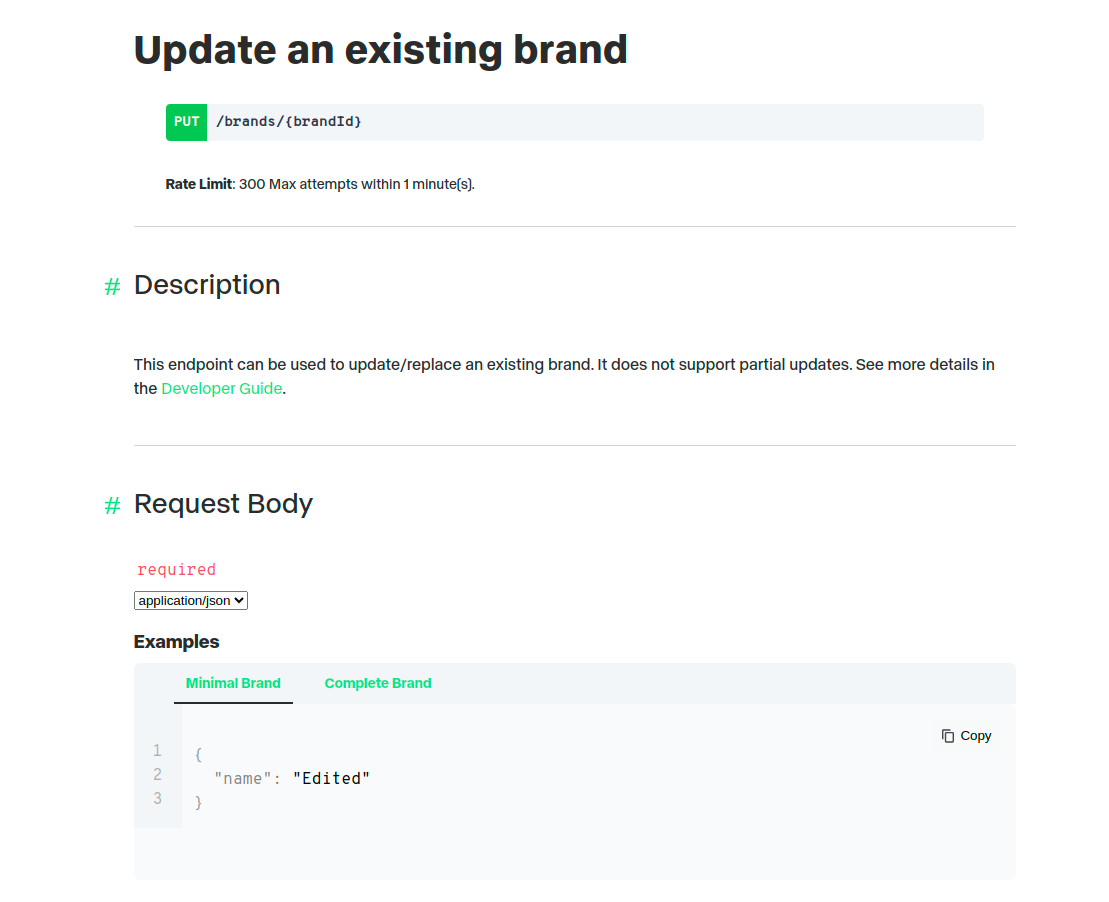 For example, we want to update an existing brand. Please select “Put” as the Method and “Brands - Update an existing brand” as the entity of the publisher.