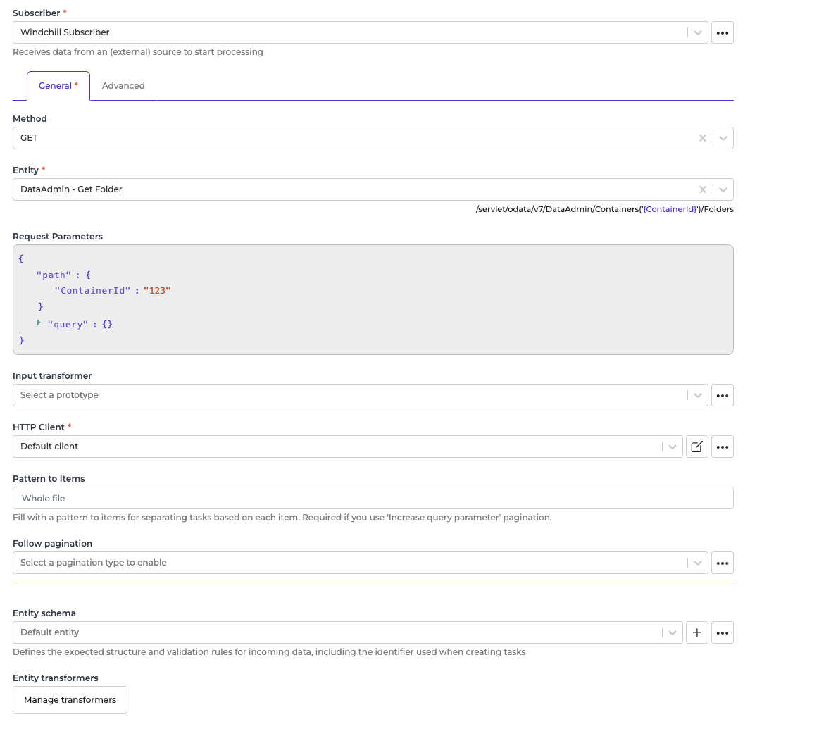 **2.1 Steps** 1. Go to Connections -> Incoming and create a new incoming configuration and select "Windchill Subscriber" as the subscriber. 2. Select the entity you want to subscribe to from Windchill. 3. Add any request parameters needed to subscribe to the entity. 4. Select the Windchill HTTP Client to use. 5. You can optionally add a transformer to transform the request parameters into something you will request from Windchill. 6. You can also optionally enable pagination to allow Alumio to fetch paginated entities.2.2 General Concept