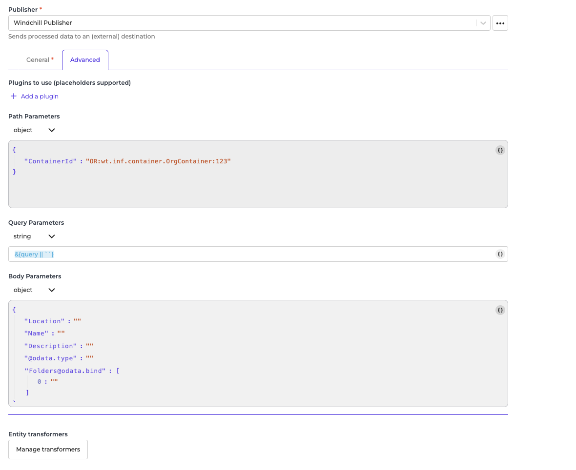 Alumio will send an API request to Windchill with URL /servlet/odata/v7/DataAdmin/Containers('OR:wt.inf.container.OrgContainer:123')/Folders