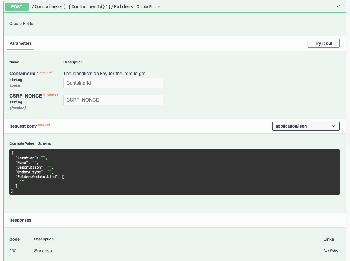 From the end point, we can see that we need to set the ContainerId as a parameter. That is why we set the “ContainerId” inside the path key in the Request Parameters.