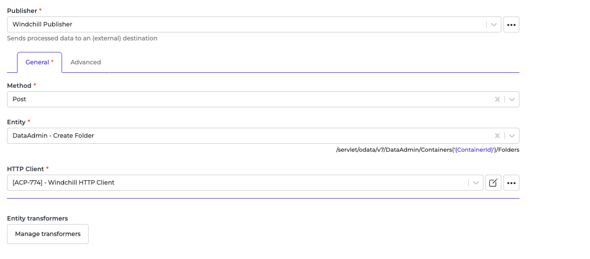- Go to Connections → Outgoing, create a new outgoing configuration and select “Windchill Publisher” as the publisher.