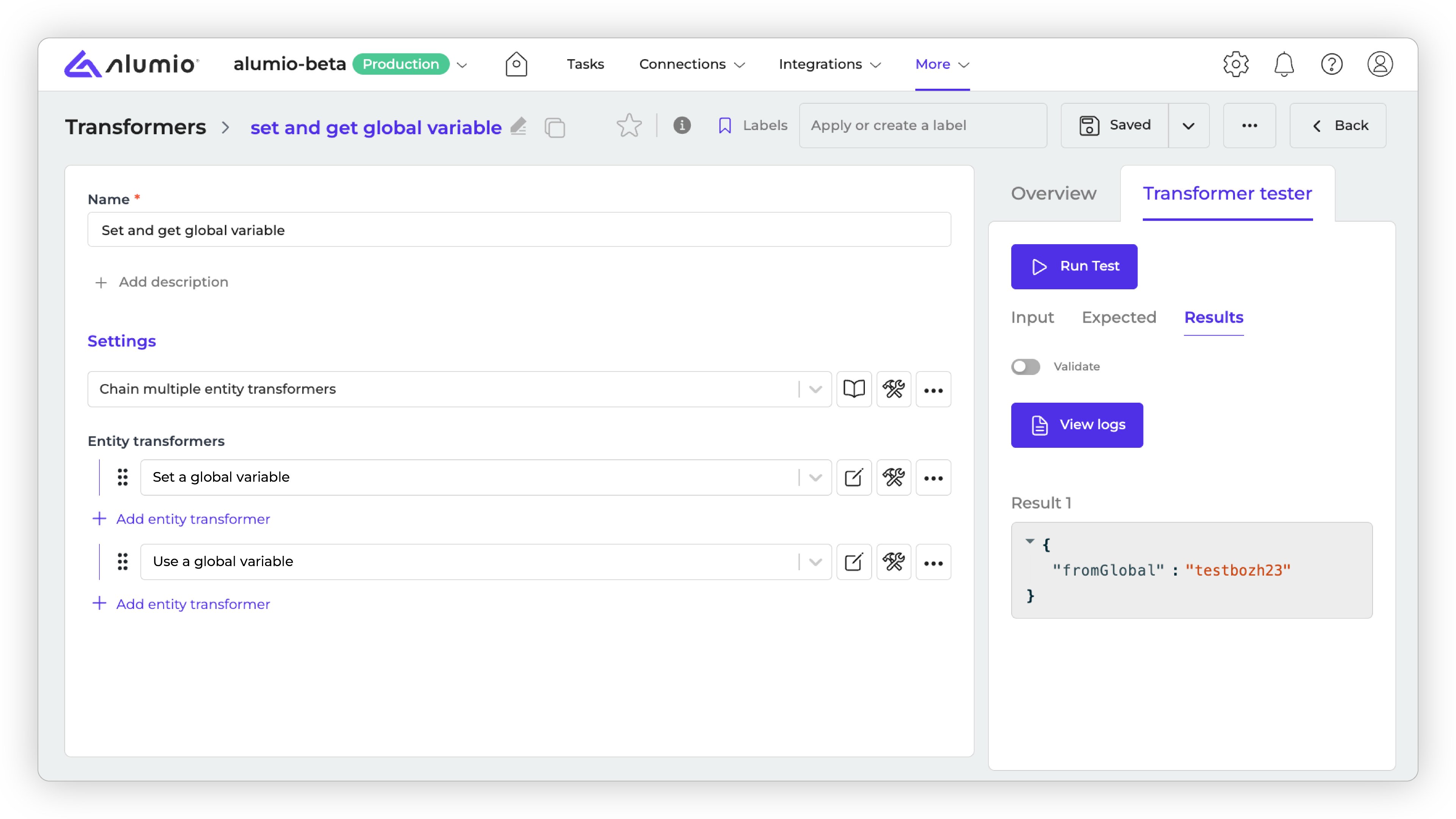 Alumio version 3.100.0-RC1 introduces features and fixes that will ensure fewer clicks, clearer feedback, and fewer ways to break things accidentally. We’ve added Global Variables to Transformers, tightened up memory handling, fixed validation quirks, and improved the copy/pasting of Transformers, among several other UI improvements and performance fixes. Just another few steps in the many more to go in making integrations simple!
