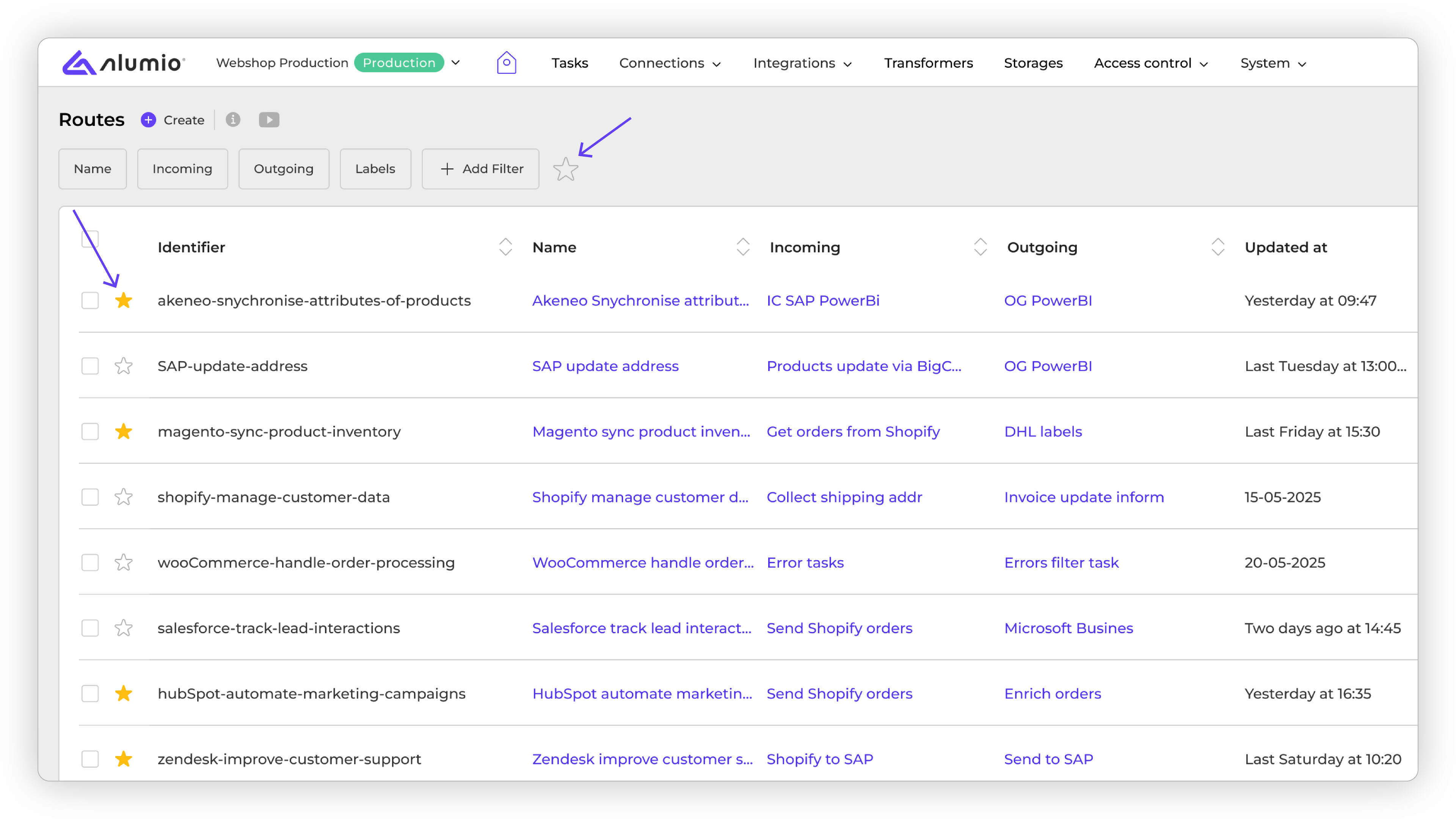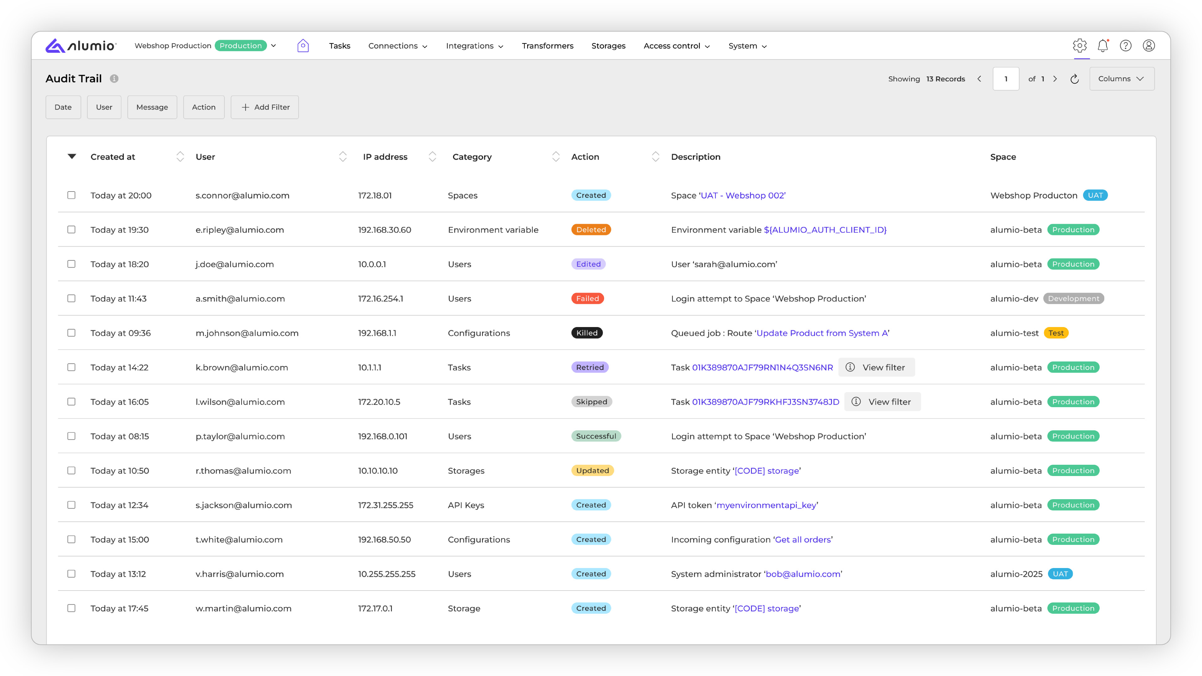 The release of Alumio version 3.97.0-RC1 brings a powerful mix of new functionality, improved usability, and fixes that make Alumio more transparent and reliable to use every day. We’ve redesigned our Audit Trail and users with Spaces now have more flexible control over managing their environment and plans. We’ve also added handy features like allowing you to add custom log messages and favorite most used configurations, along with several other features and fixes that make debugging your integrations and creating smarter workflows even more simple.