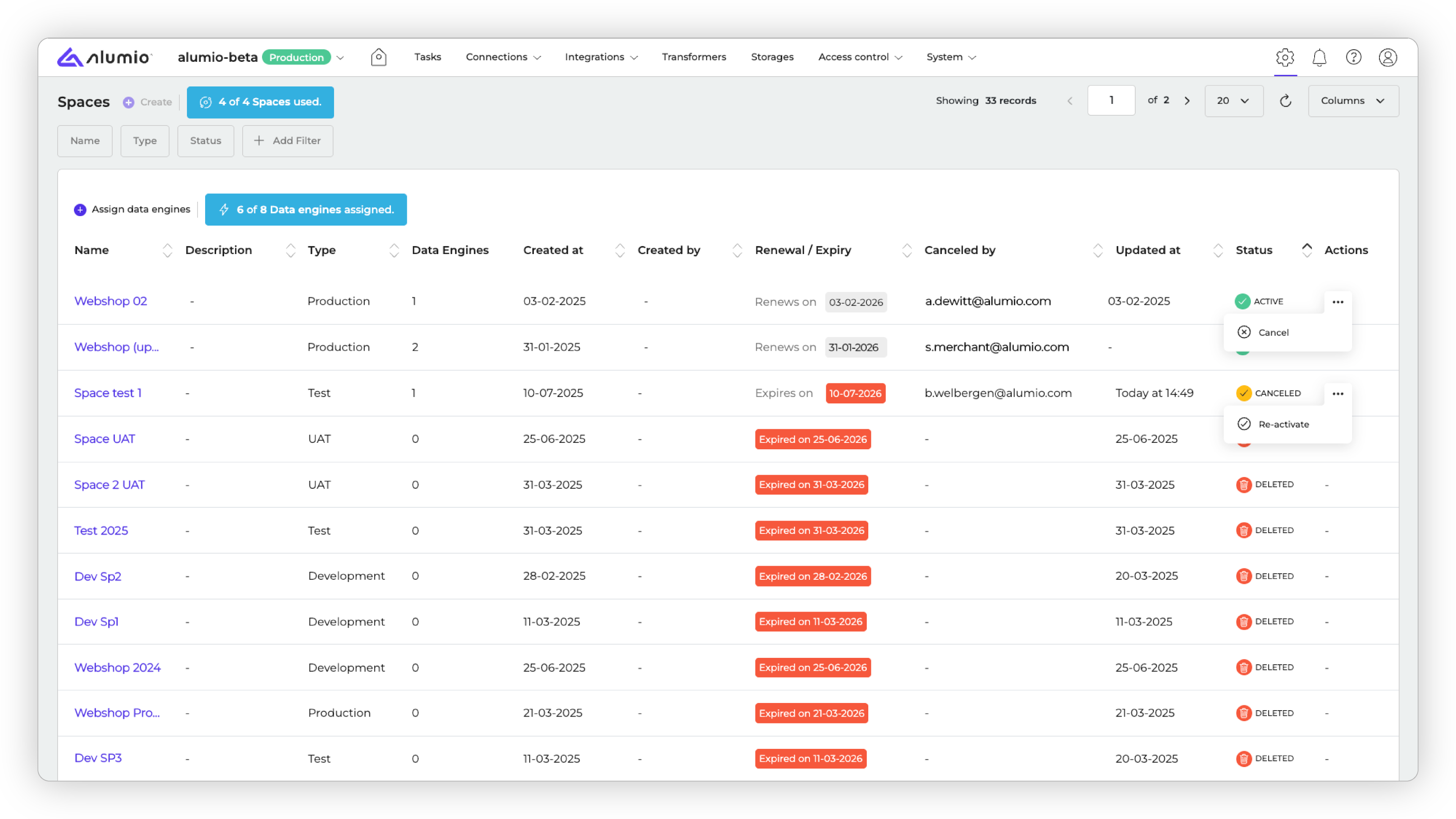 We’re excited to announce that Spaces can now be cancelled and reactivated in Alumio itself! Users can manually cancel Spaces, let them expire automatically, or reactivate Spaces, giving you full flexibility in managing environments. Besides that, we have overhauled the Spaces wizard for easier use and added clear “Spaces Terms & Conditions” when creating a new Space for better transparency.