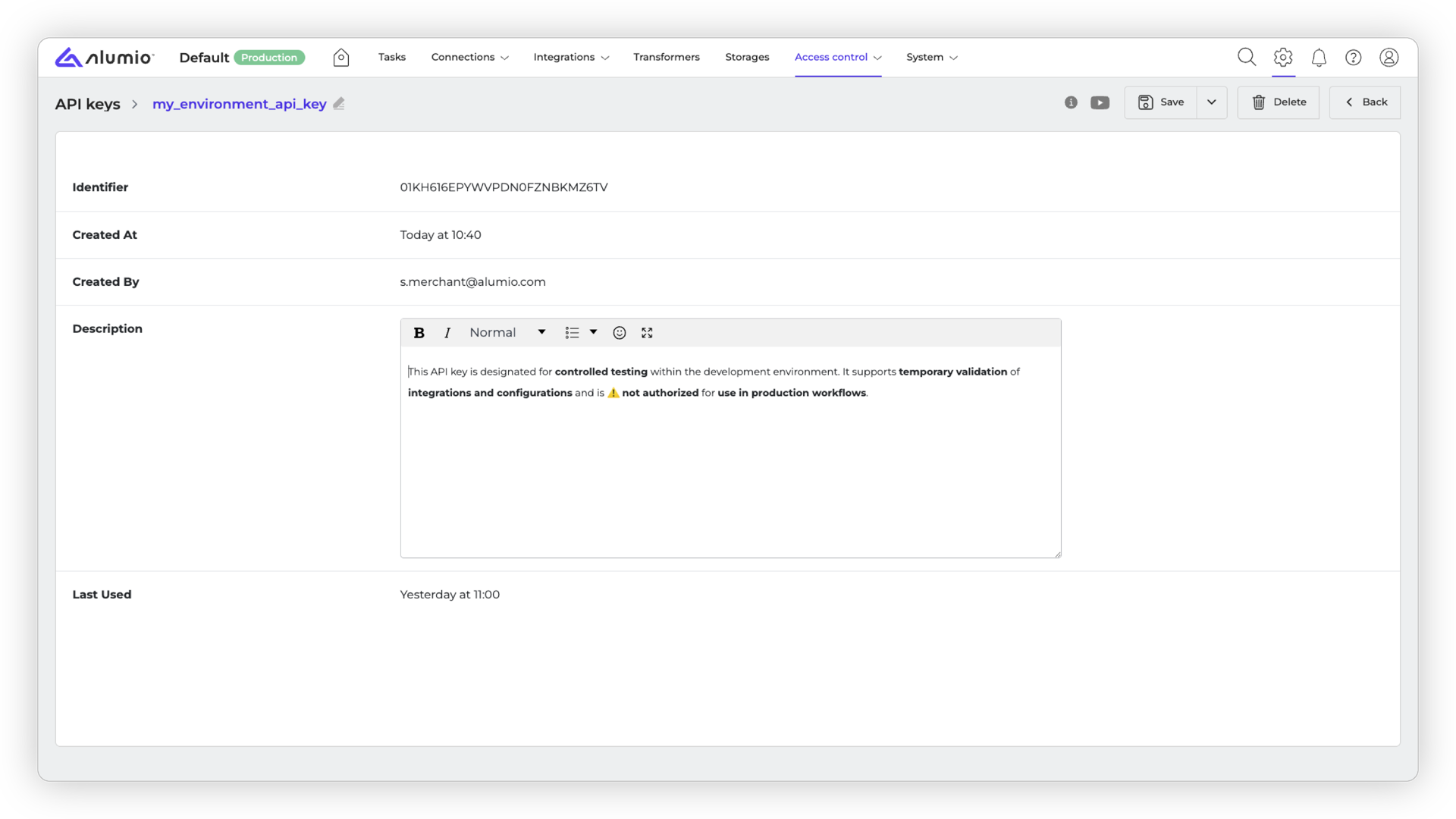- Delete – Permanently removes the API key.