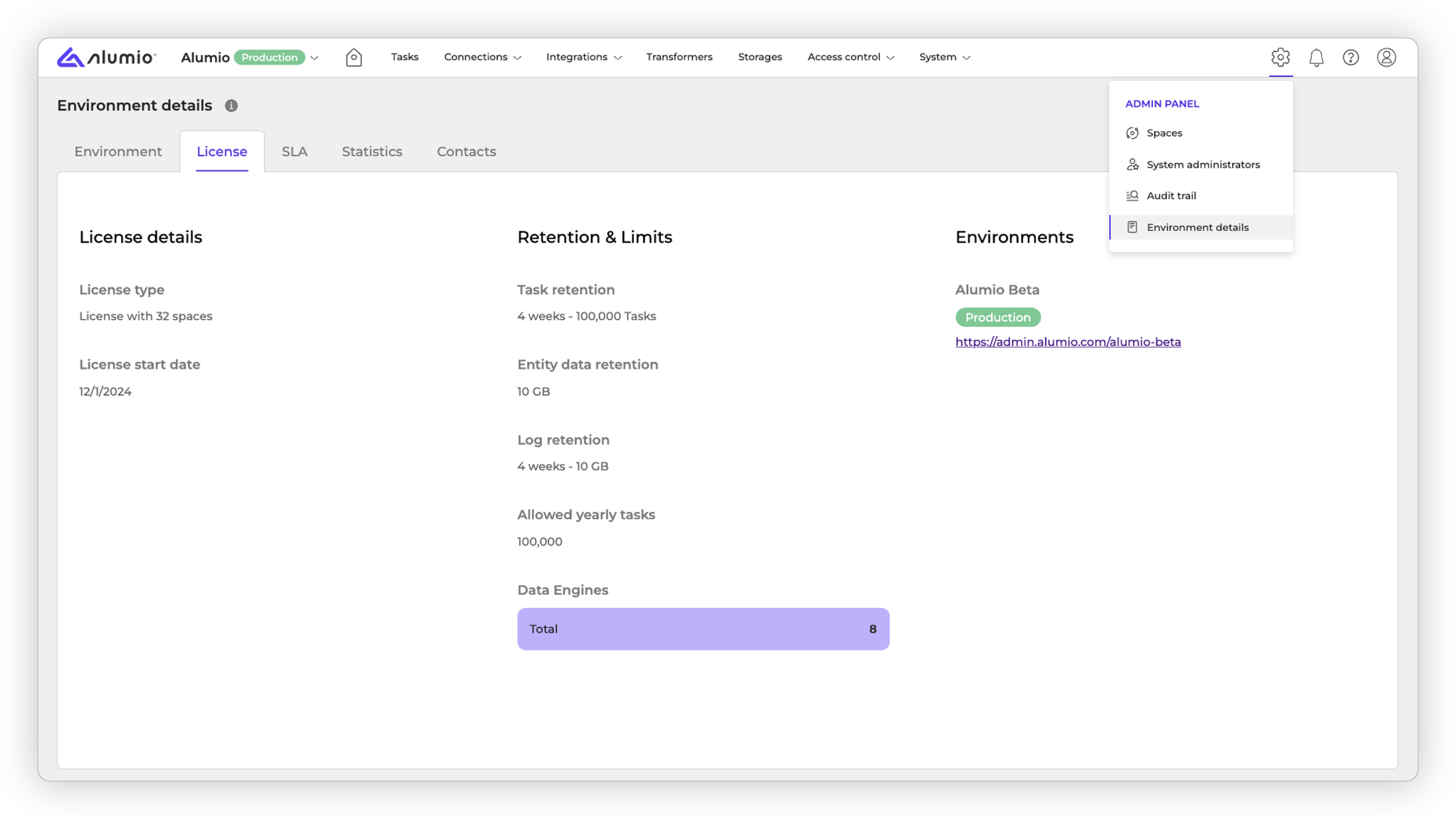 All information about the available quantity of Data Engines can be found by navigating the path: Admin panel →Environment details. In this tab, you can see the available Data Engine queues due to the license.