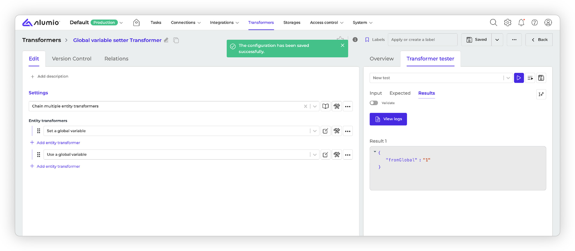 Step 2: Once you save the transformer, you can also create another one (whether as a chain or a separate transformer) where placeholders can be used, such as a Value setter. You can enter the global variables there, chain two transformers, and run them to ensure that reusing variables works as expected.