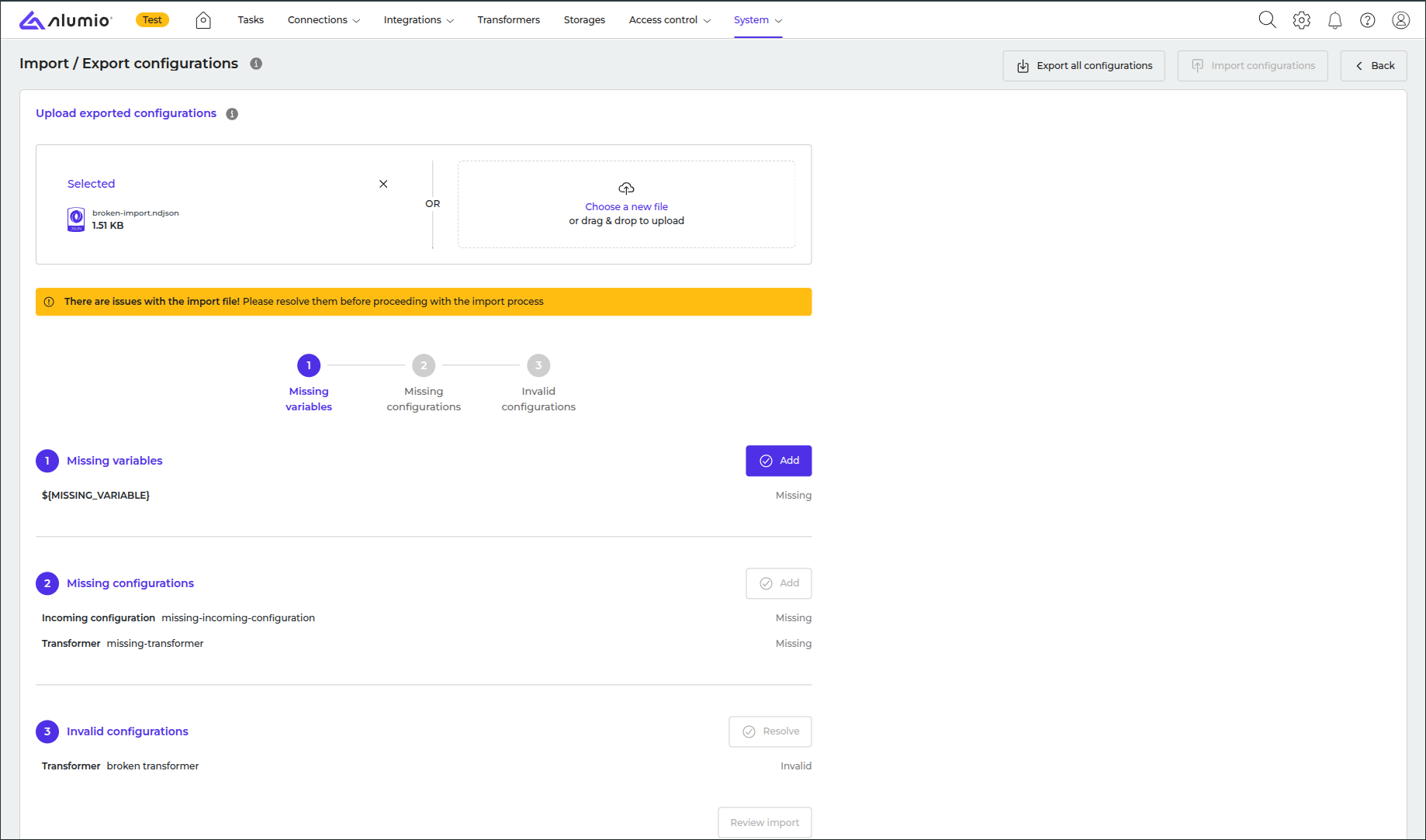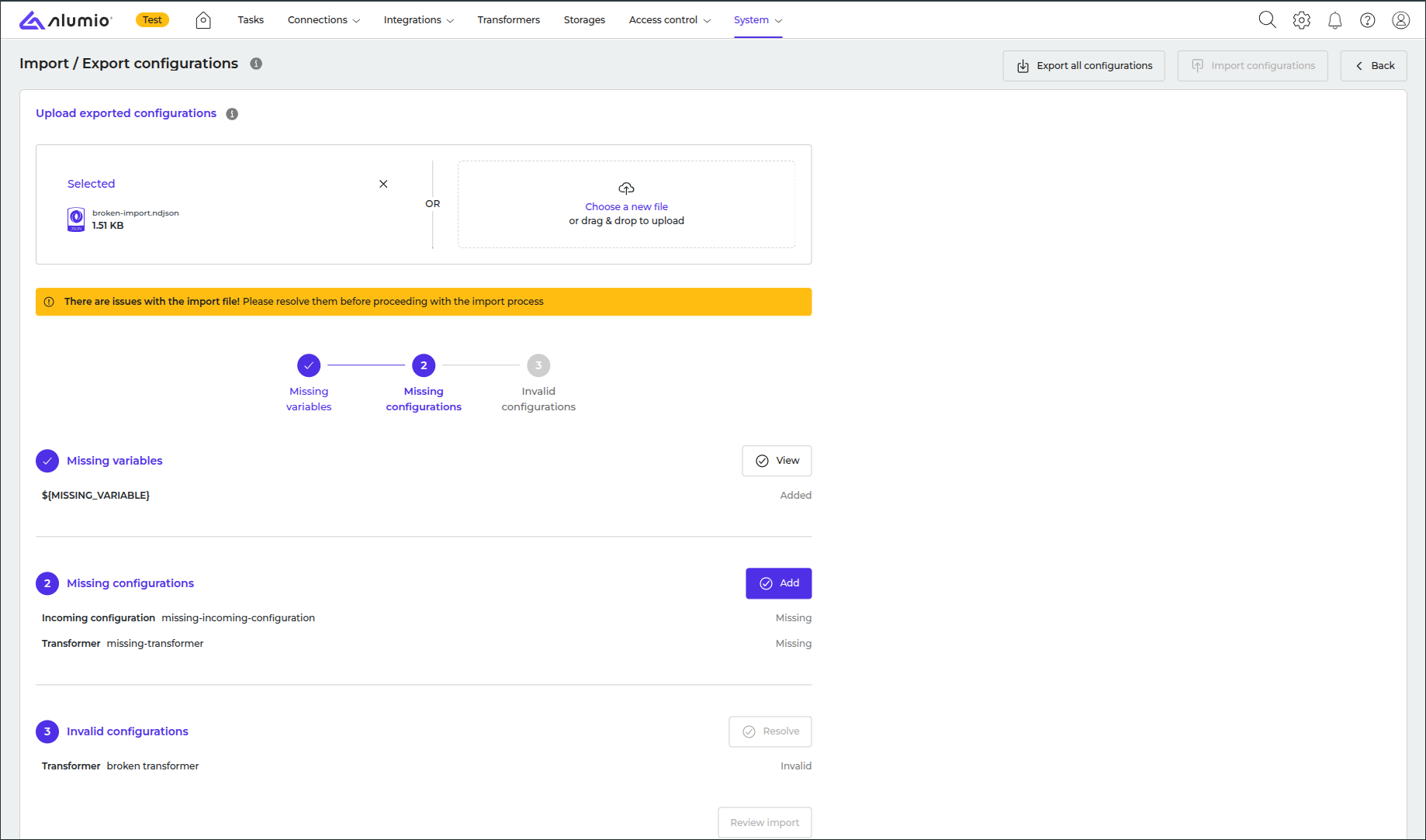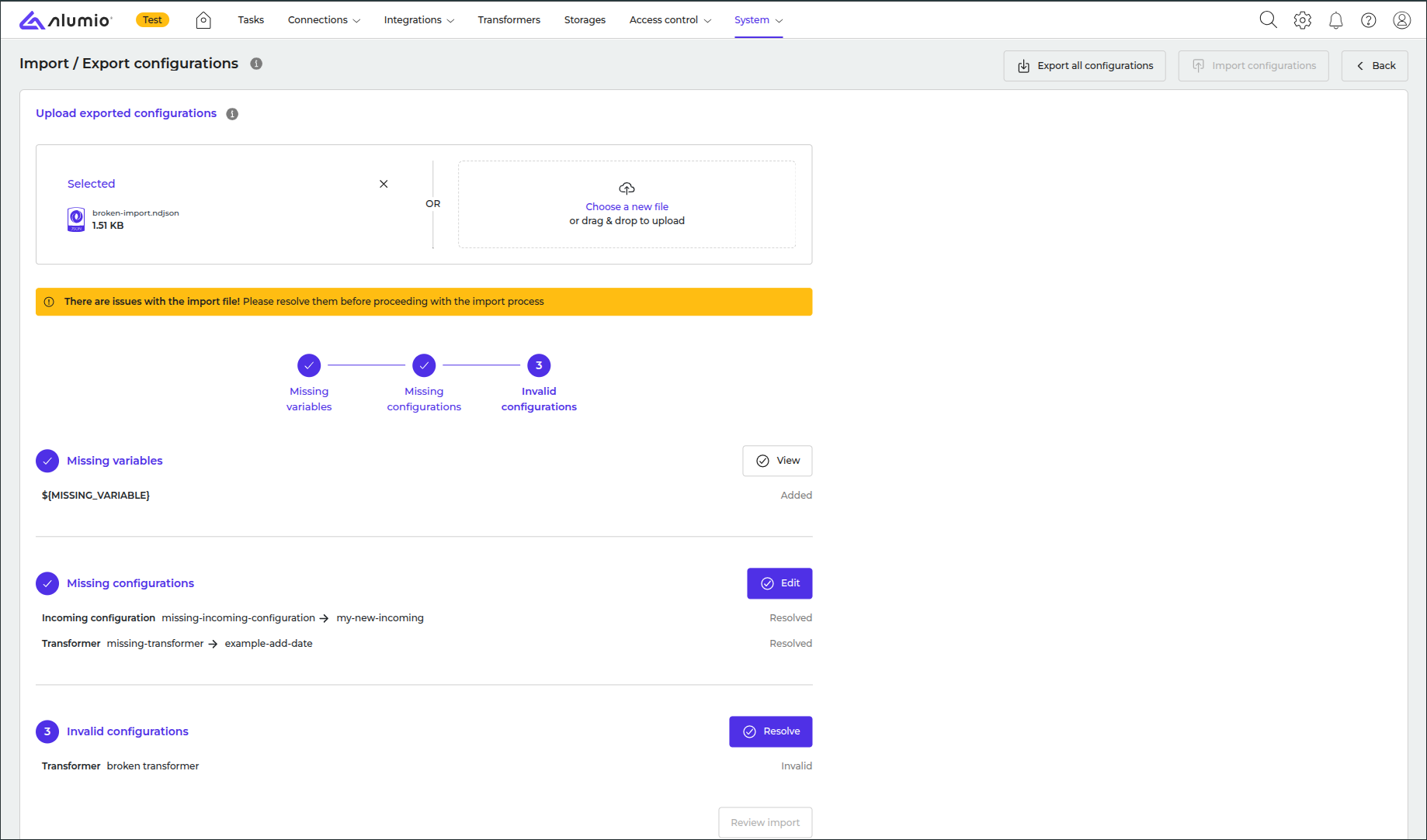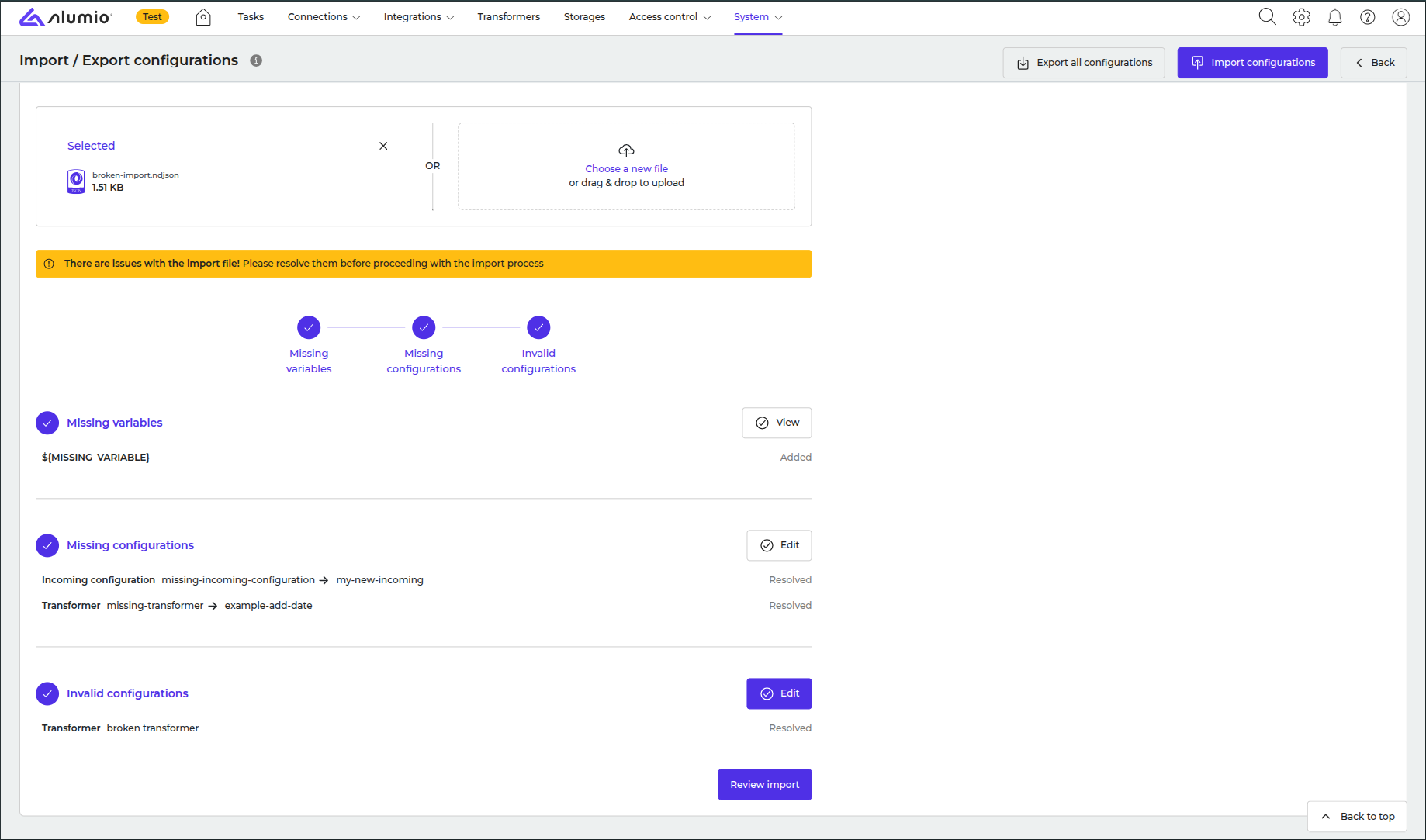 After fixing the issues, the Import configuration button becomes available.