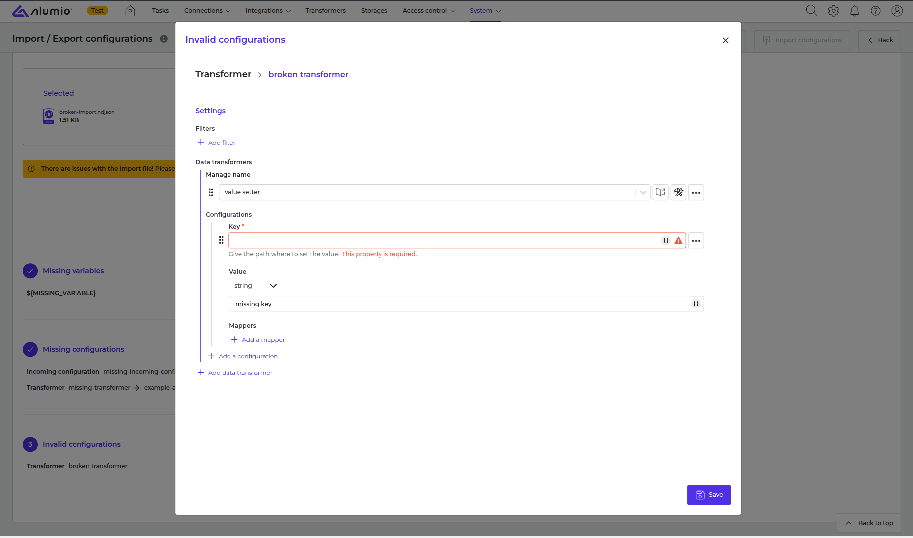 To do that, click on the Add button towards the list of missing configurations. A pop-up will be expanded, allowing you to select an existing configuration/transformers or create a new one.