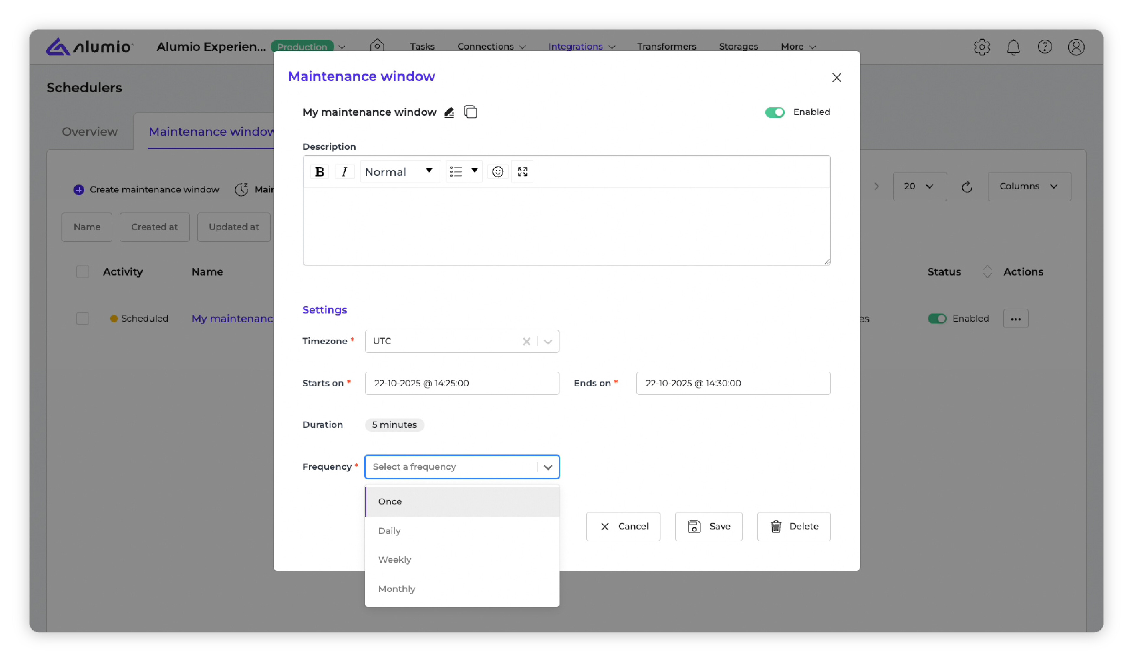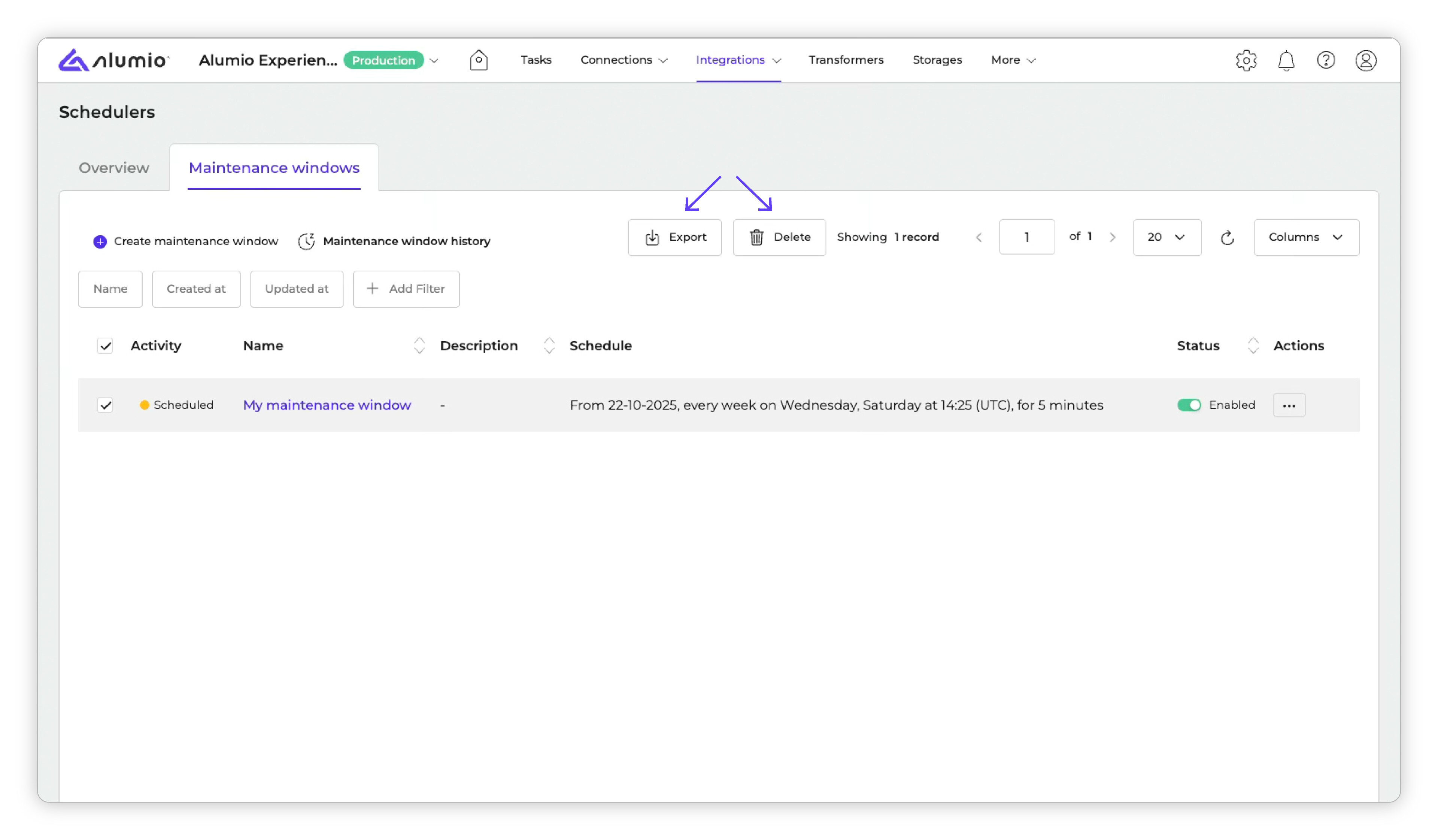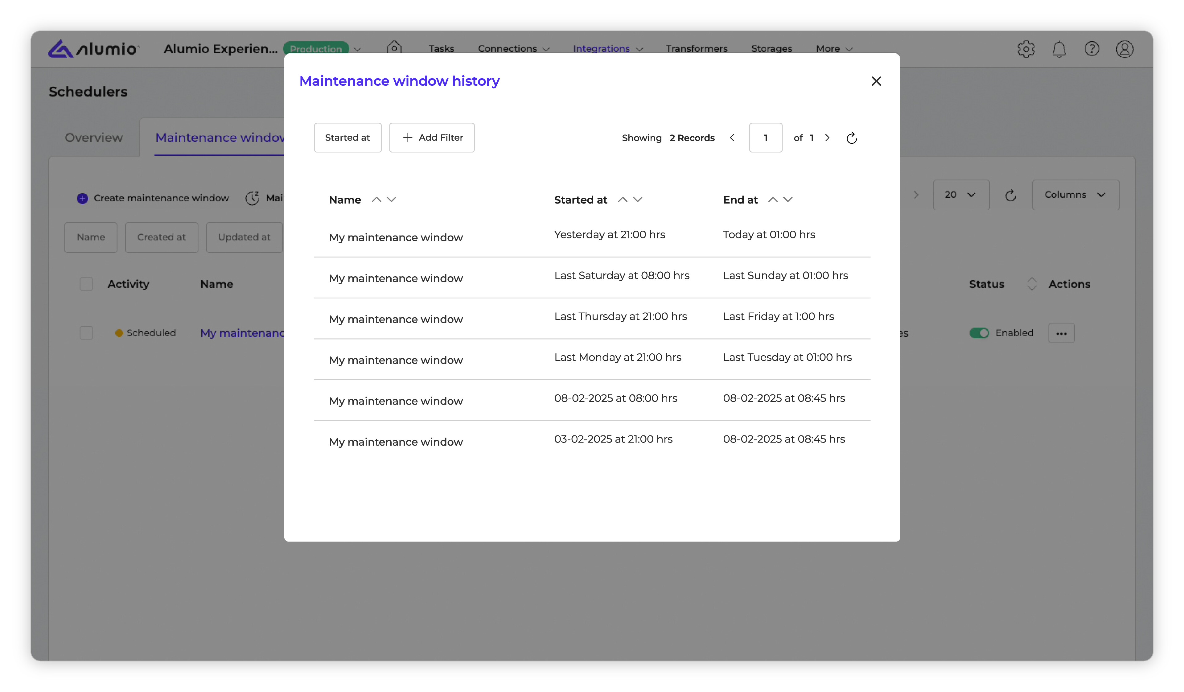 External systems often undergo scheduled maintenance, during which they become temporarily unavailable. When Alumio continues attempting to connect during these periods, it can lead to failed processes and misleading error alerts. To help avoid this, users can configure specific timeframes where schedulers are automatically paused. This enables better control over integration behaviour, reduces noise in monitoring, and ensures that planned downtime doesn’t trigger unnecessary alerts or failed tasks through Maintenance windows.