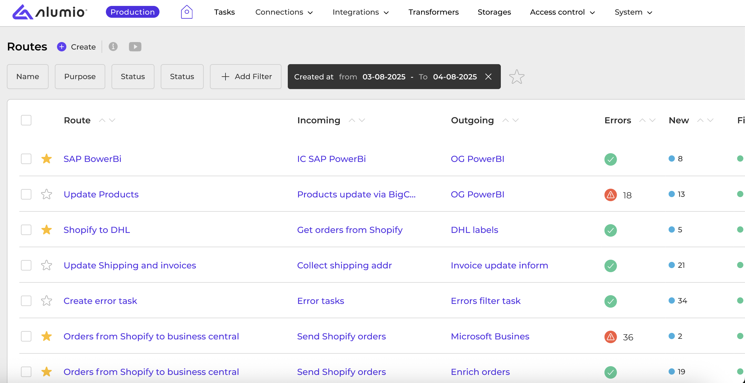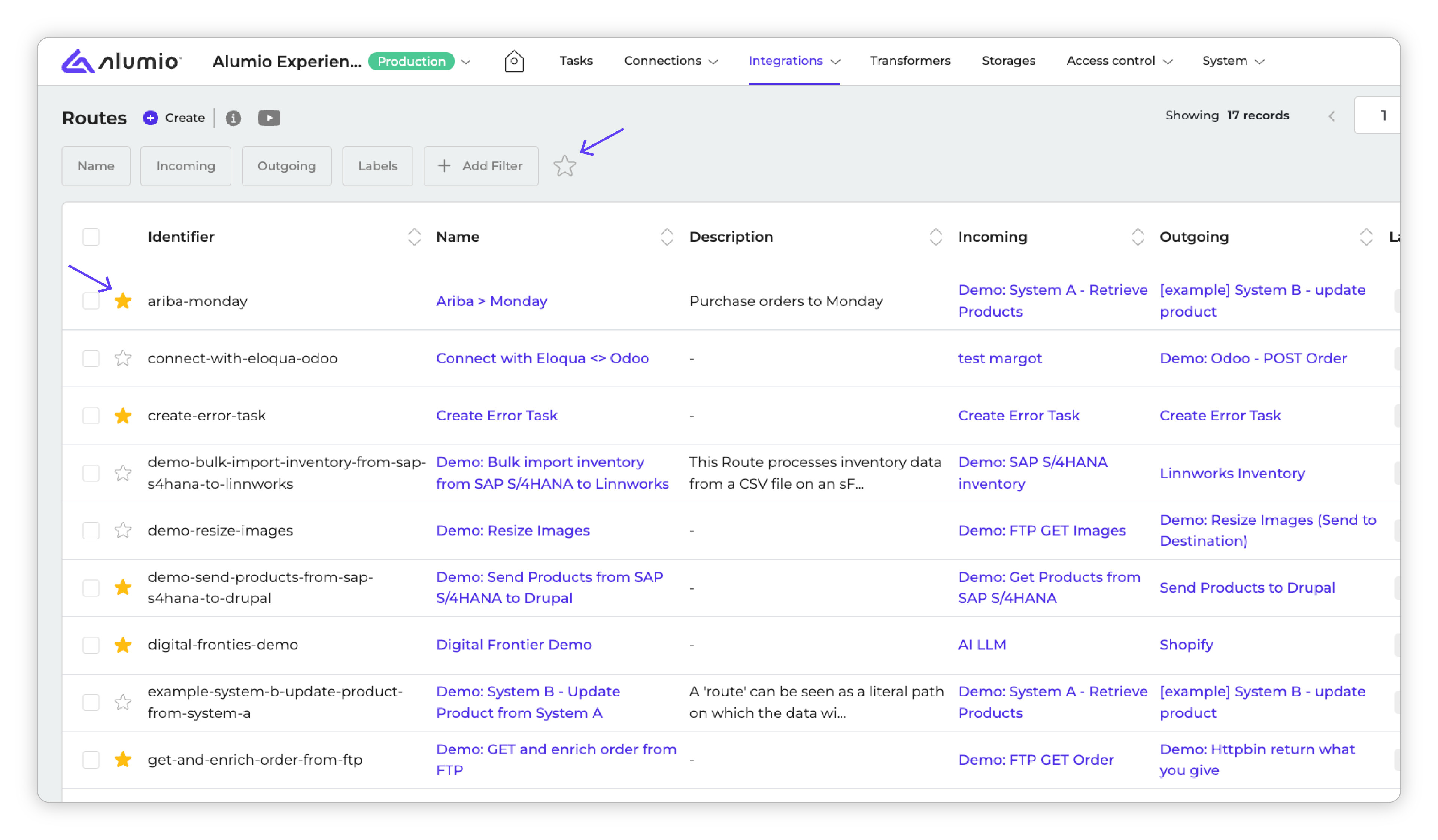 Step 3: To filter by favourites, click on the “Star” icon in the filter bar. Once applied, the filter will display only your favourite Route/Incoming configurations.