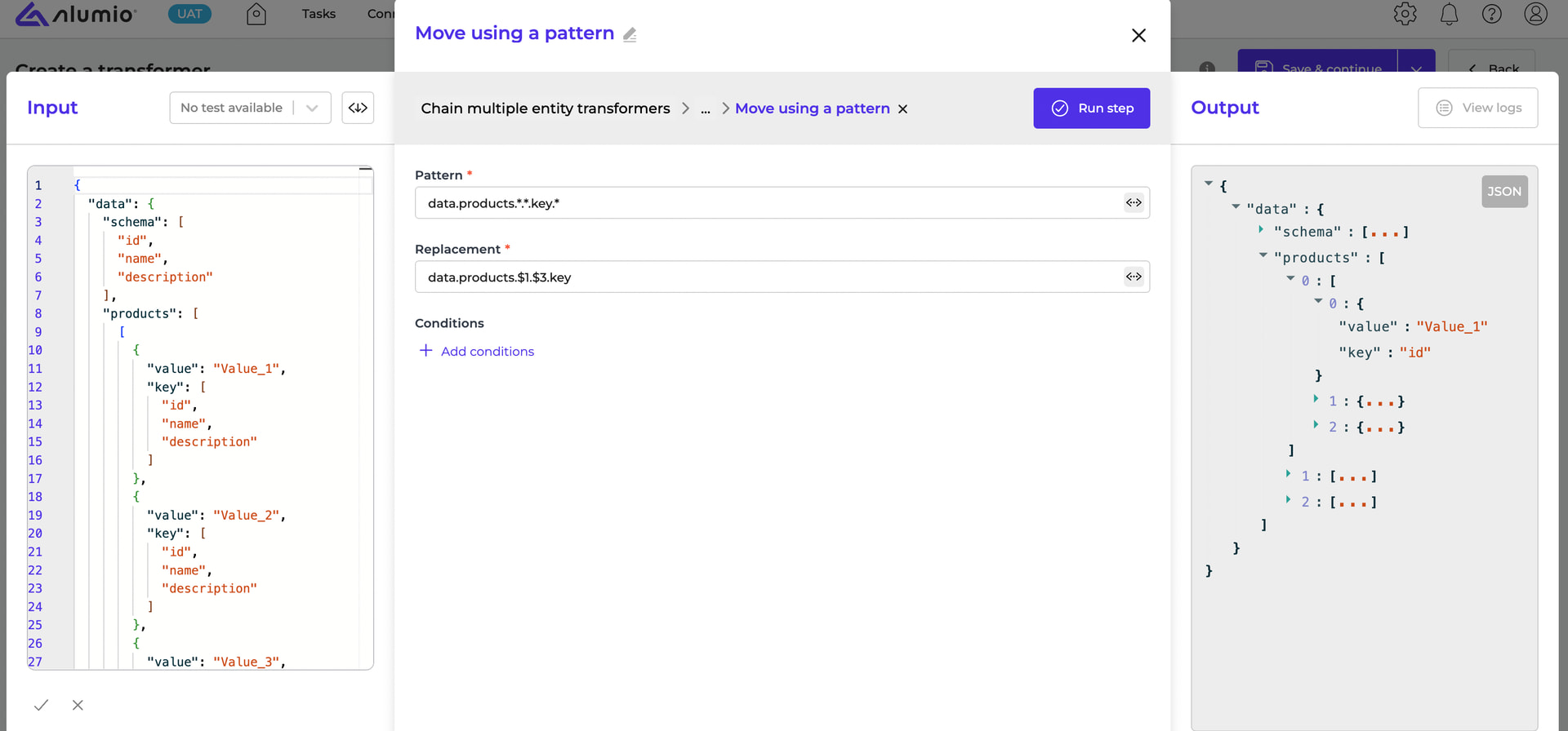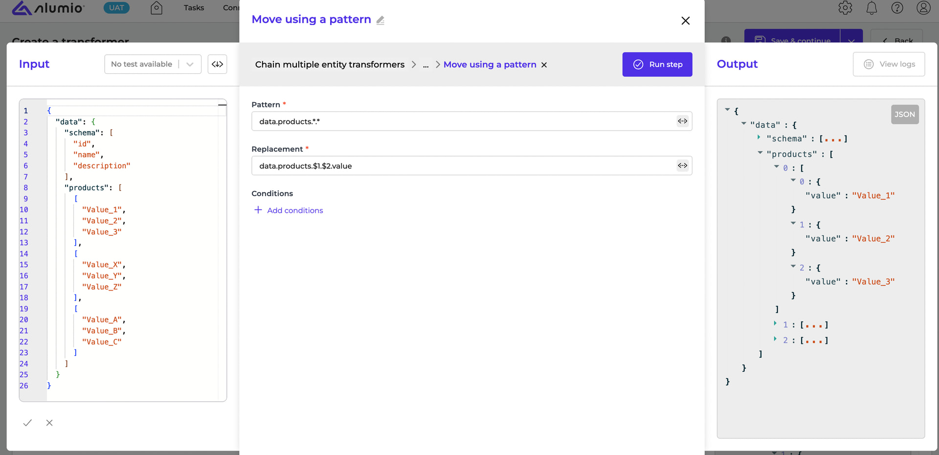 Add “Data, transform data using mappers and conditions” and put Move using pattern as the first transformer to make each value be in a property called value.
