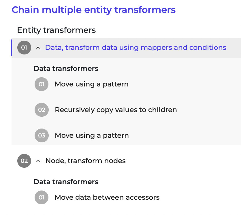 First, use Chain multiple entity transformers as we need to use “Data, transform data using mappers and conditions” and “Node, transform nodes” within a single entity transformer.