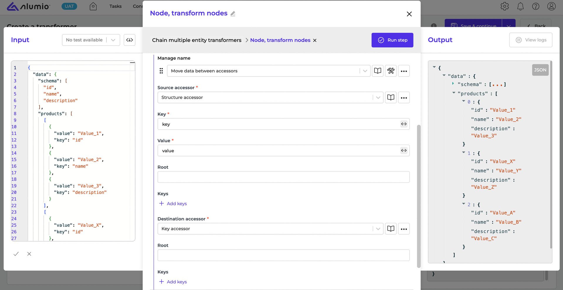 Finally, loop into the data.products array using “Node, transform nodes” and use “Move data between accessors” to transform the key and value properties of each value object into key: value.