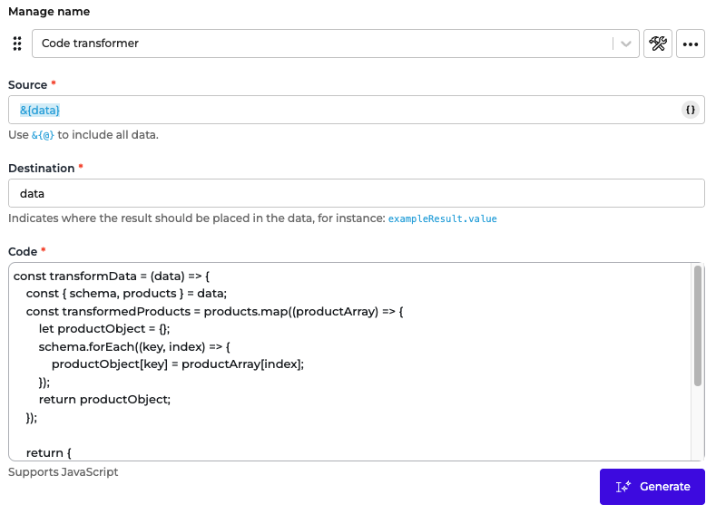 I used the AI feature by clicking the “Generate” button to generate the code by adding a prompt and the sample data you provided.