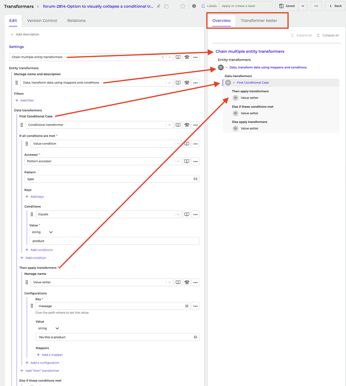 We understand the issue you’re encountering. When a conditional transformer contains many actions, it can become difficult to scroll through and keep a clear overview of the IF / THEN / ELSE structure. Having collapsible sections would indeed make it much easier to focus on the specific part you’re working on.