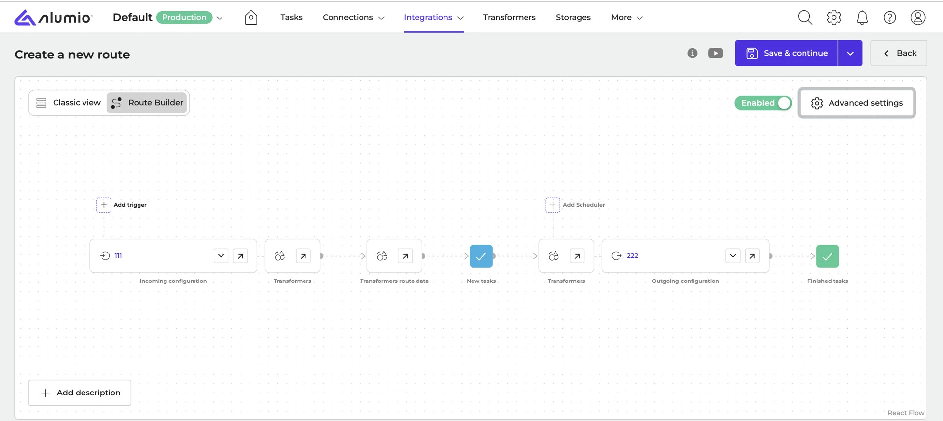 Real-time Processing - Enabling this allows Alumio to run the route immediately as tasks are created by the incoming data. When this is active, a scheduler is not required, as the integration reacts instantly to incoming data.