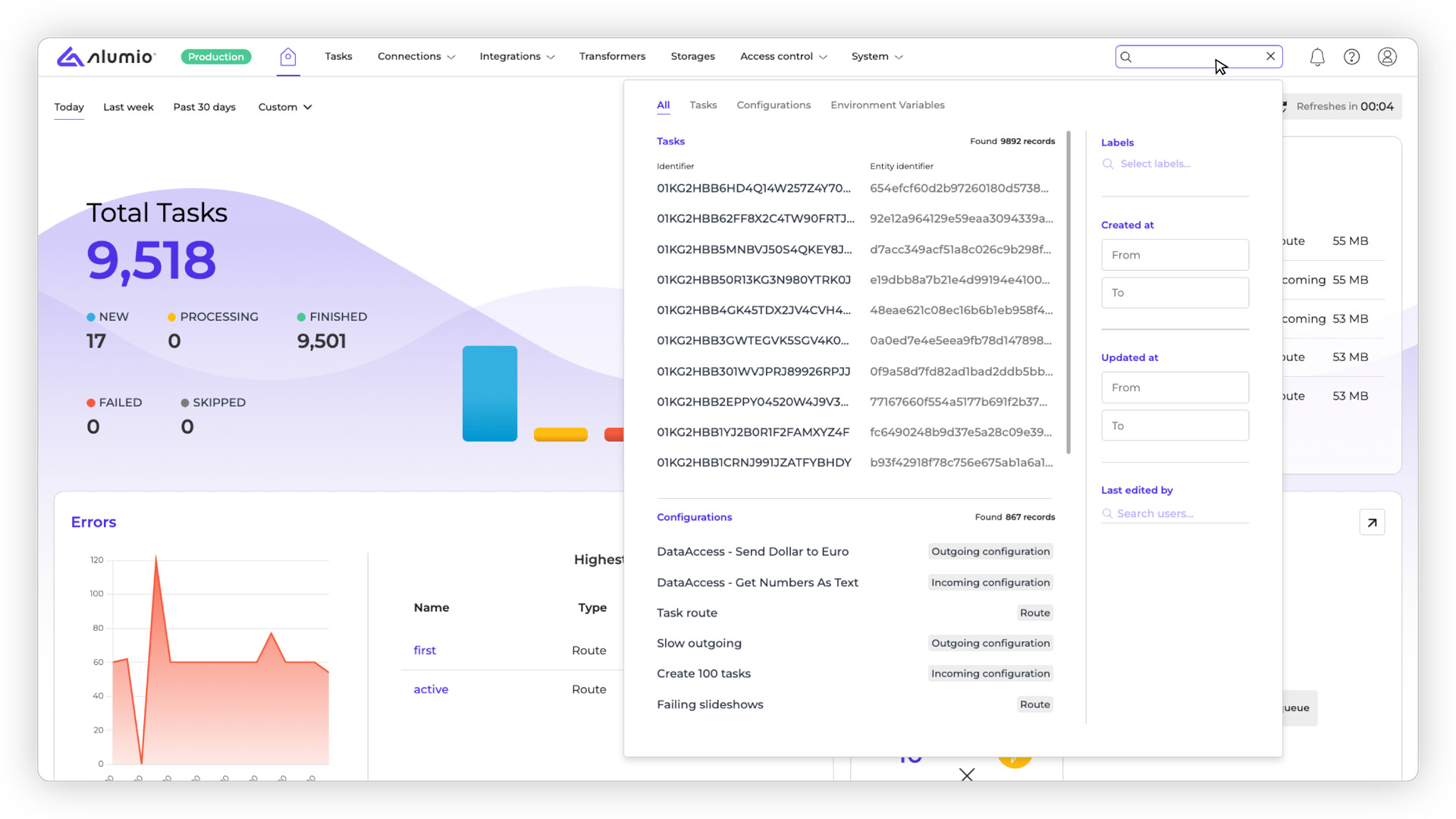 This way, the Search functionality lets you easily find configurations, tasks, and environment variables, shows the total number of results per tab, and allows you to filter by labels, date ranges, and the user who last edited them.