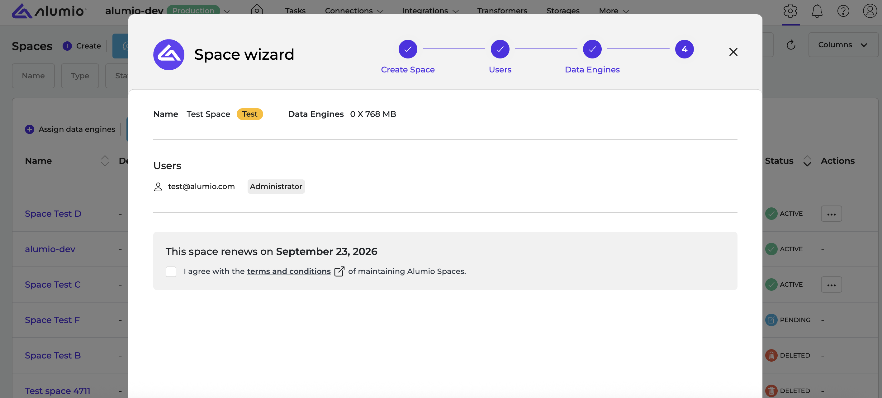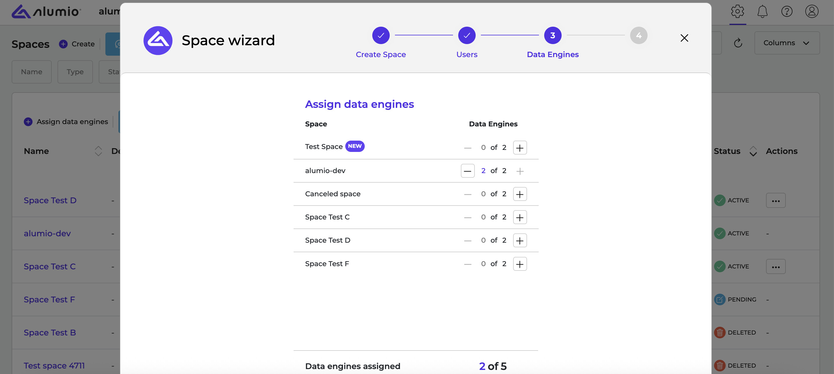 In the final step, Data Engines can be assigned to the new space. The number of available Data Engines per space depends on the Alumio environment’s license.