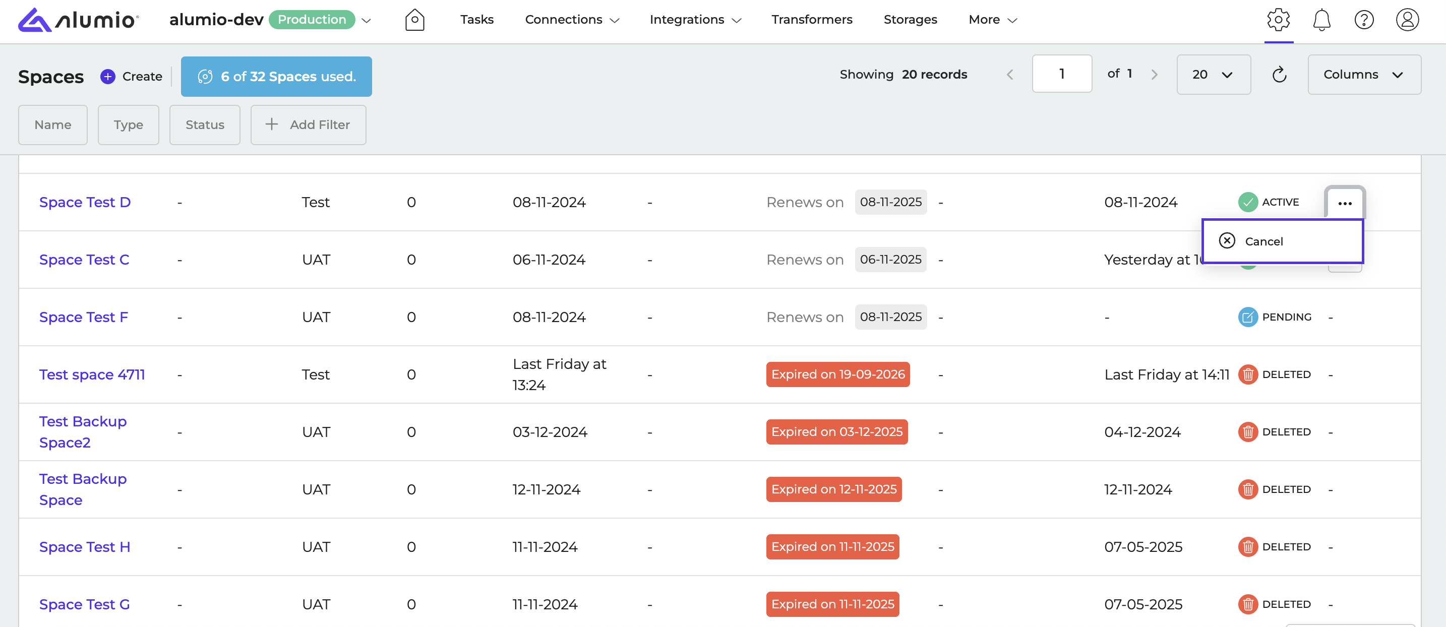 Additionally, you can reactivate the Space by clicking on Actions → Cancel. This way, your Space becomes active.