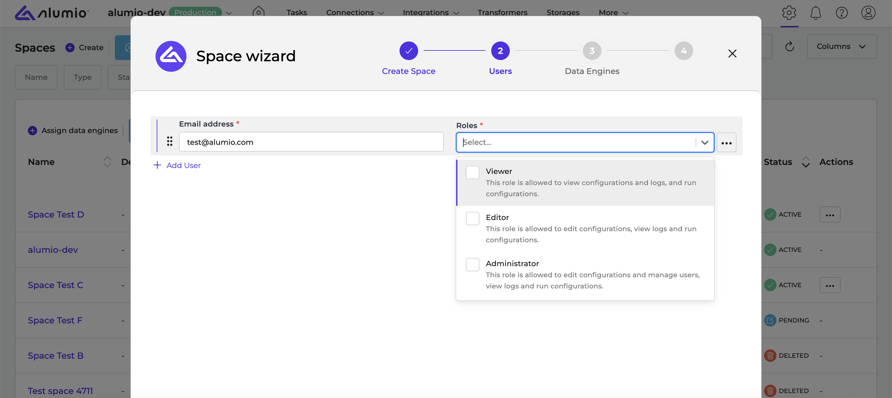 System Administrators can assign Data Engines to specific spaces from the Space Management page. The number of Data Engines that can be assigned per space depends on the Alumio environment’s license.