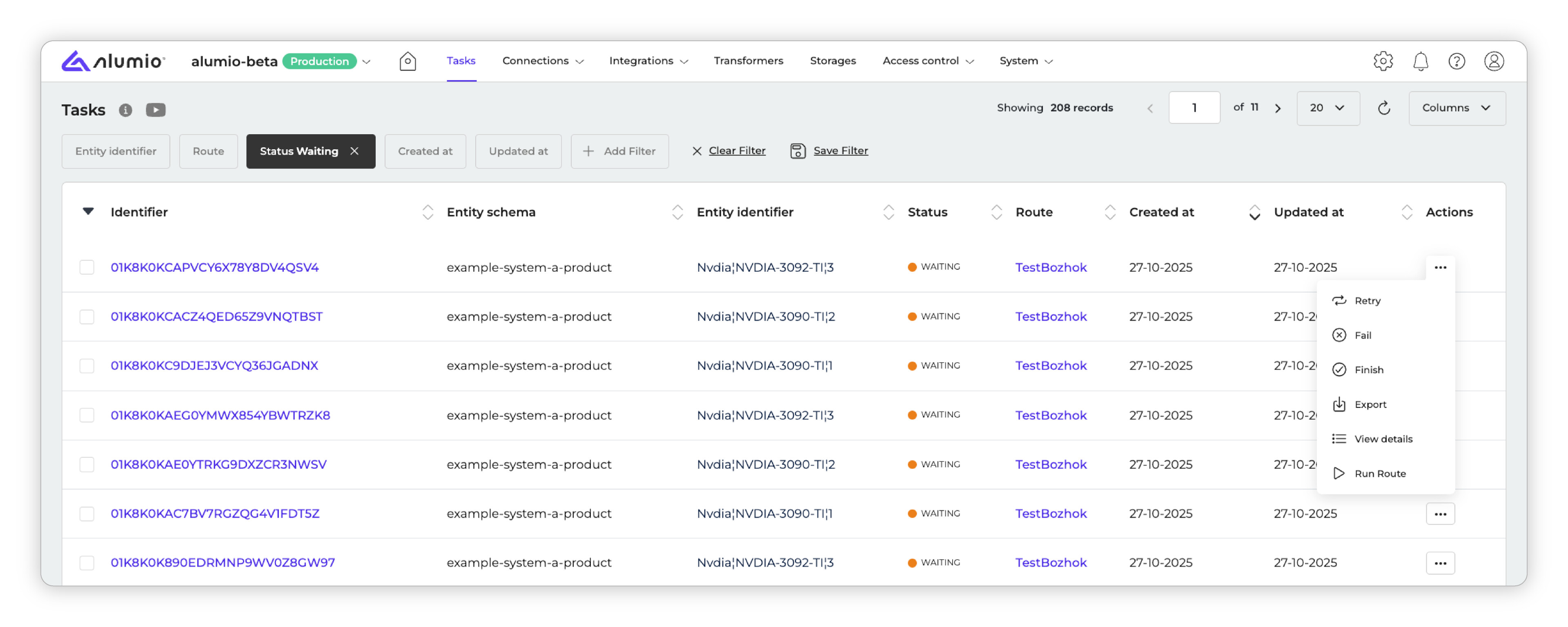 In these cases, it can be useful to set tasks to the “Waiting” status instead. This status can later be updated to Finished or Failed, either through the Alumio API or via the Alumio Dashboard.