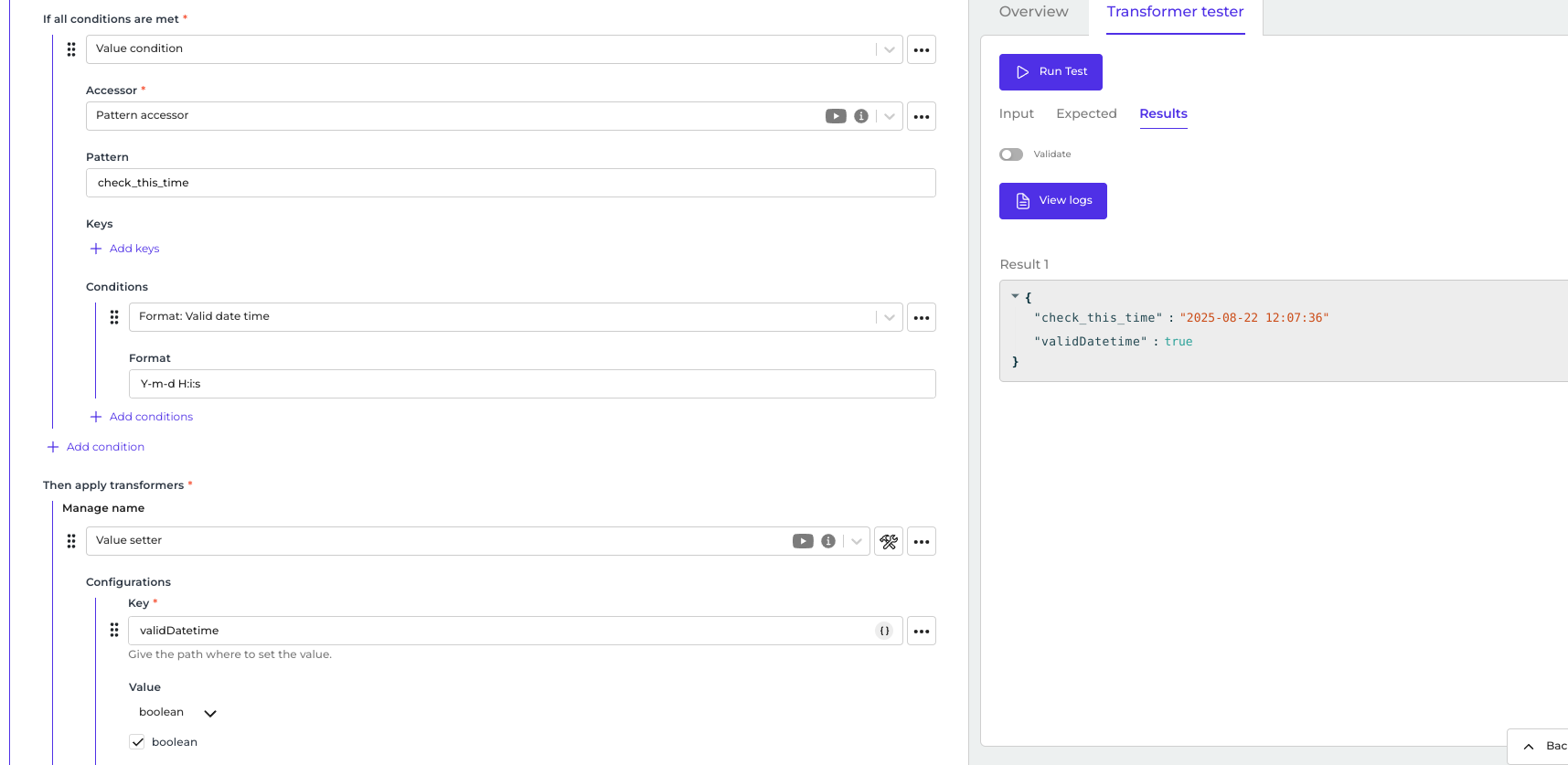 I want to validate if a field with a datetime exists. What do I write in the “expected result” field? Is there some kind of wildcard? Is this documented somewhere?